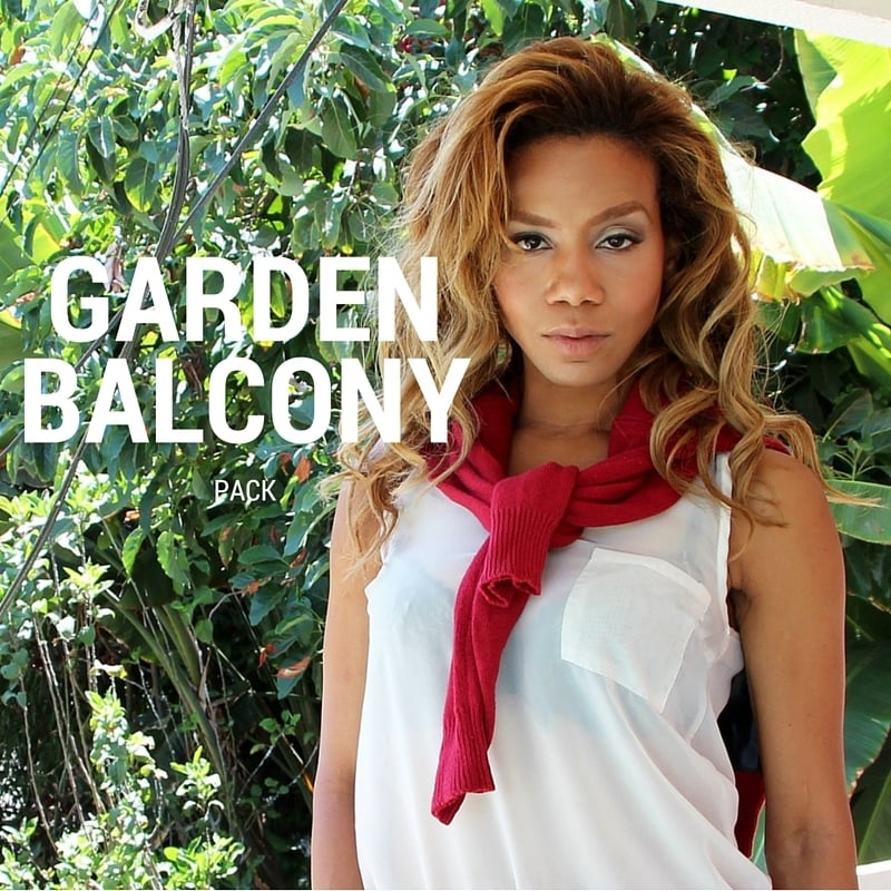 This photo pack includes 22 images of a woman casually dress on balcony garden.